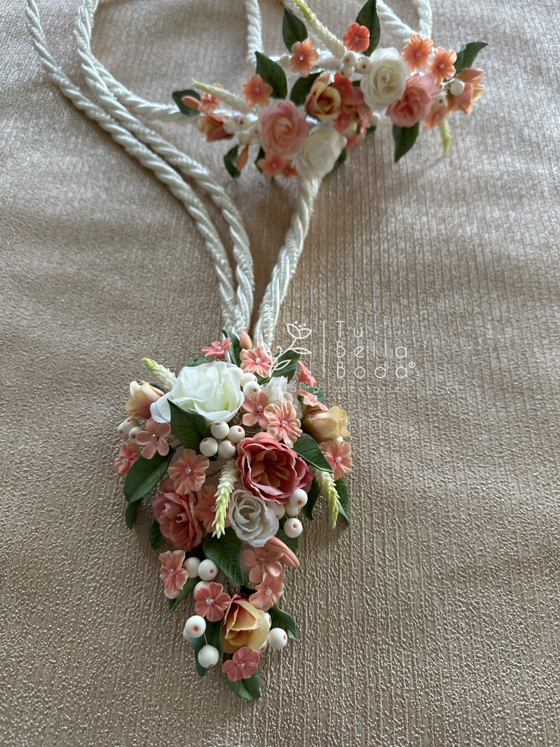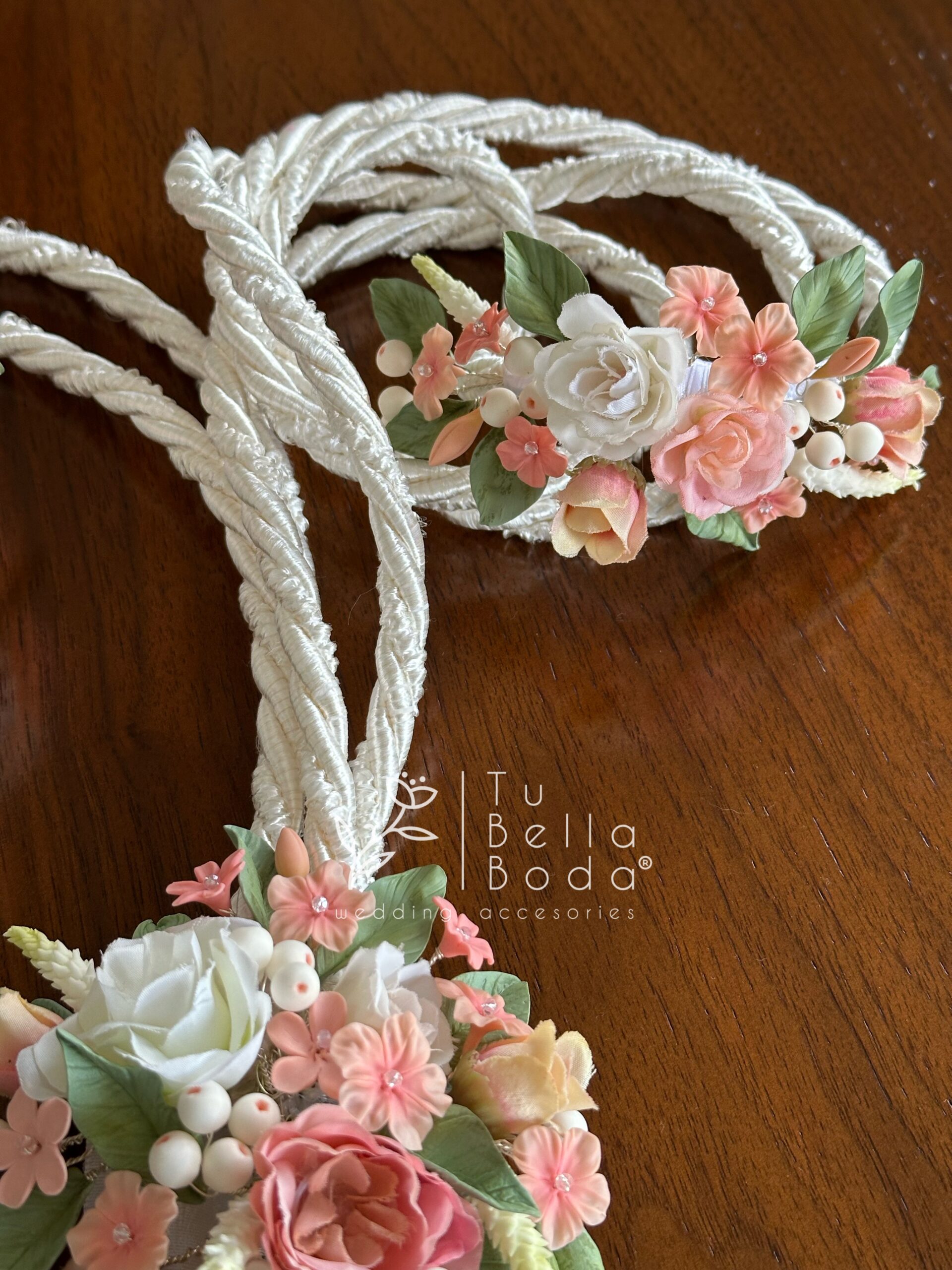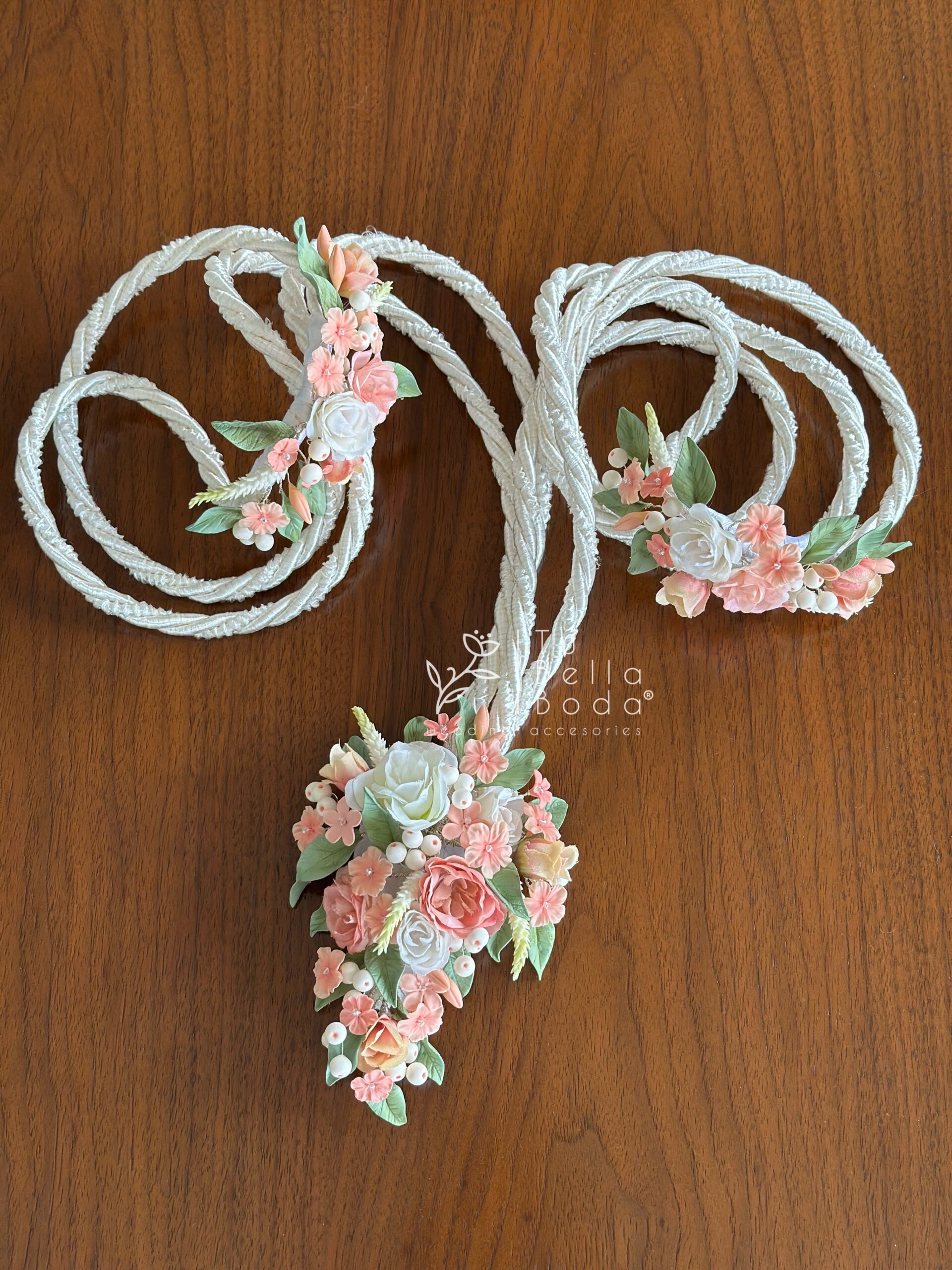 El Lazo Albba es una creación artesanal pensada para realzar la magia del momento nupcial. Su cordón blanco de textura suave se engalana con flores modeladas a mano en porcelana y delicadas flores de tela, en una paleta romántica de tonos blanco, rosa y durazno, acentuada con hojas verdes aportan frescura y luminosidad.