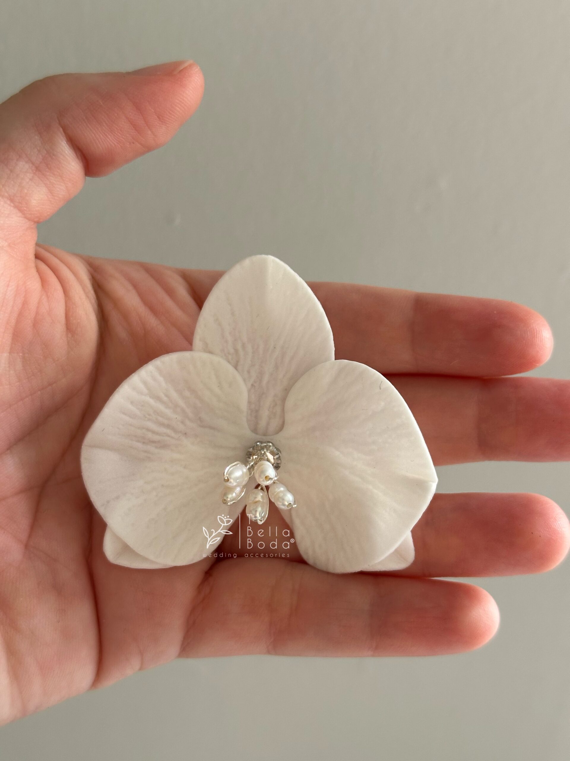 Set Sara: tres horquillas de porcelana en forma de orquídea con perlas de río naturales, un accesorio floral elegante para novias. Su diseño ligero y resistente permite que se integren fácilmente en recogidos, moños bajos o peinados semi sueltos, sin perder comodidad. Cada producto es único y hecho a mano con diversos materiales.