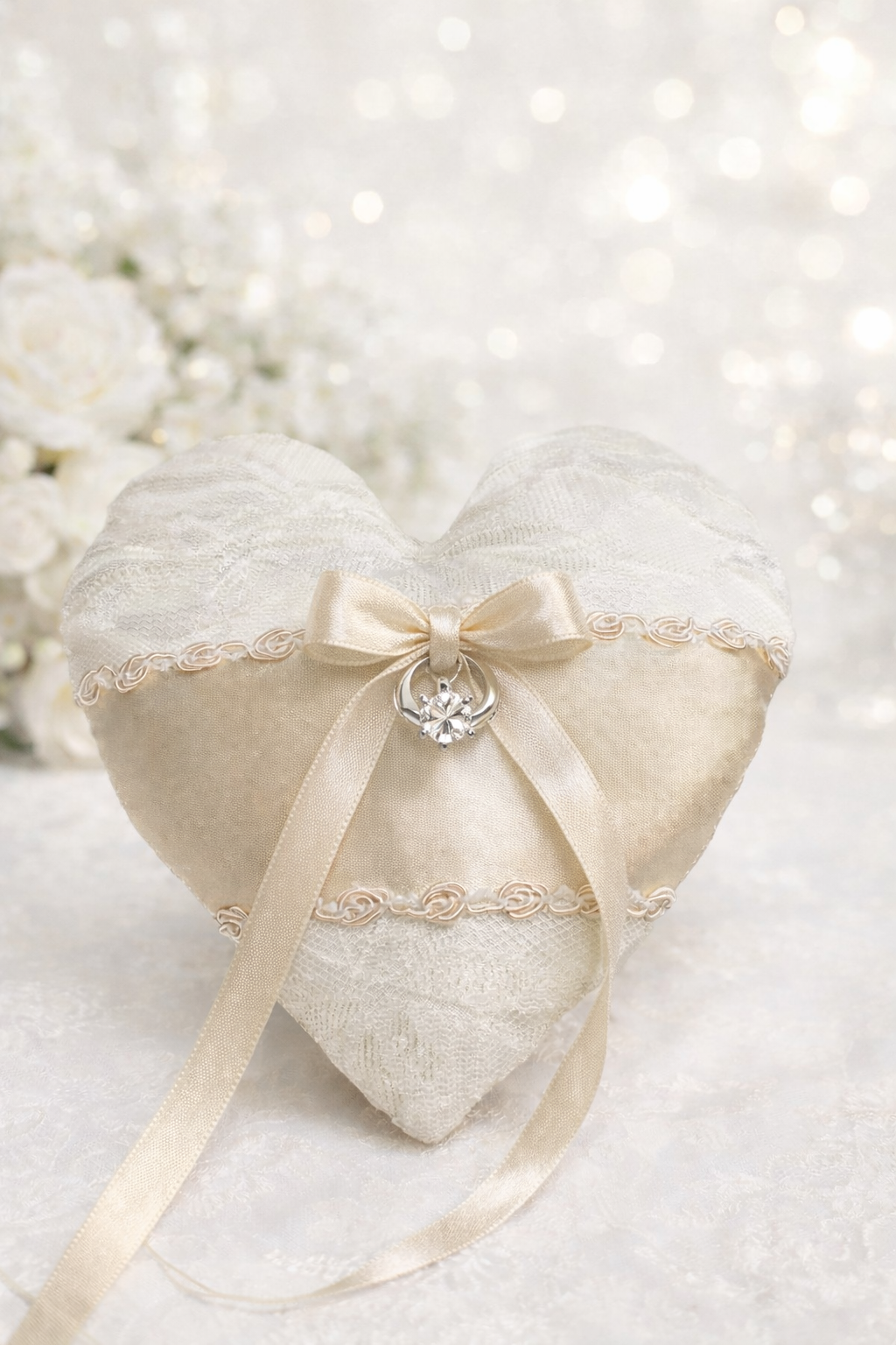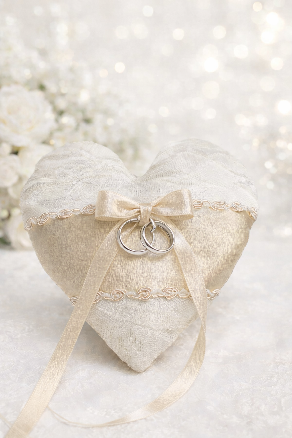 El Cojín para Anillos Corazón es una opción romántica y elegante para llevar los anillos de boda durante la ceremonia. Su diseño en forma de corazón, con tonos marfil, encaje y listón satinado, lo convierte en un accesorio delicado y simbólico, ideal para bodas civiles, religiosas o celebraciones con estilo clásico y romántico. Perfecto para parejas que buscan un cojín para anillos especial y lleno de encanto.