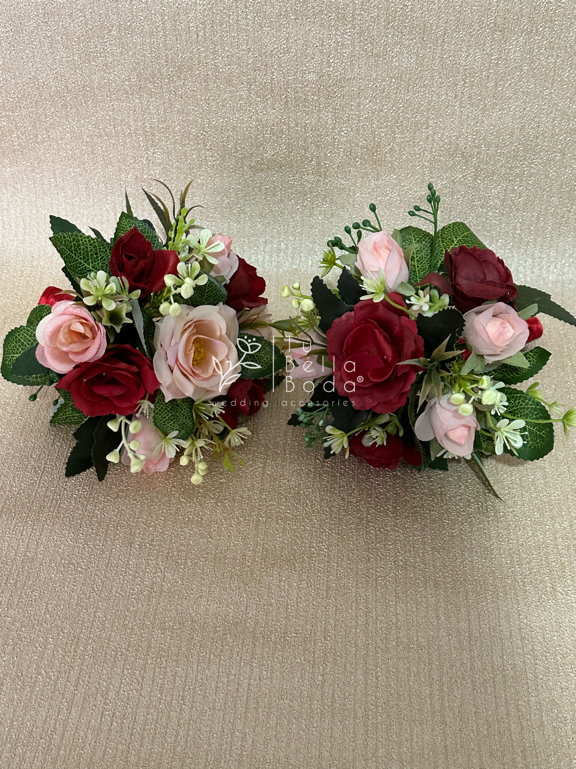 El ramo Callanthe chico combina rosas en tonos burdeos y rosados con hojas verdes, creando un diseño elegante y romántico. Ideal para novias que buscan un toque de sofisticación en su boda o para usar como ramo de aventar, ofrenda o para sesiones fotográficas.