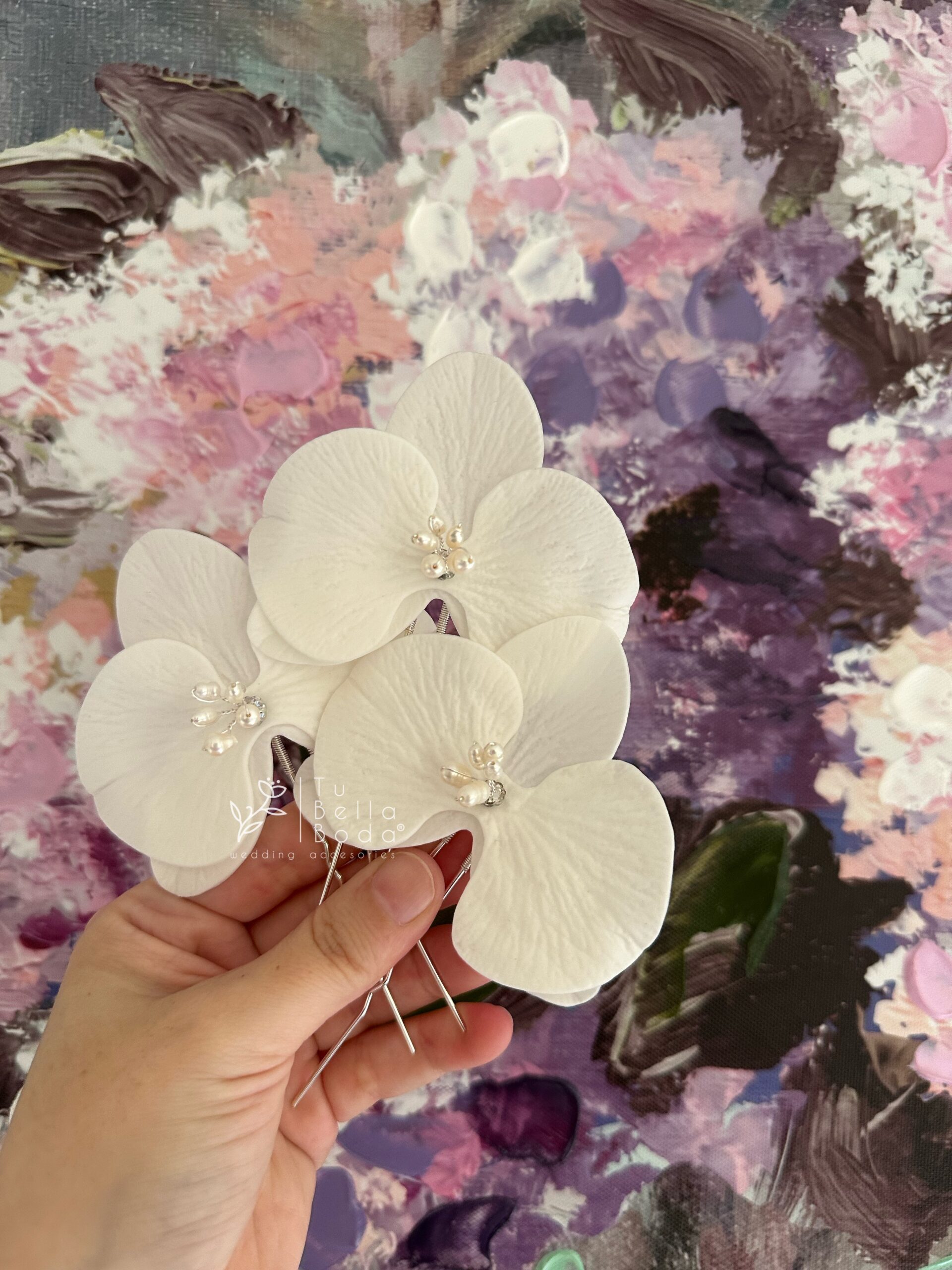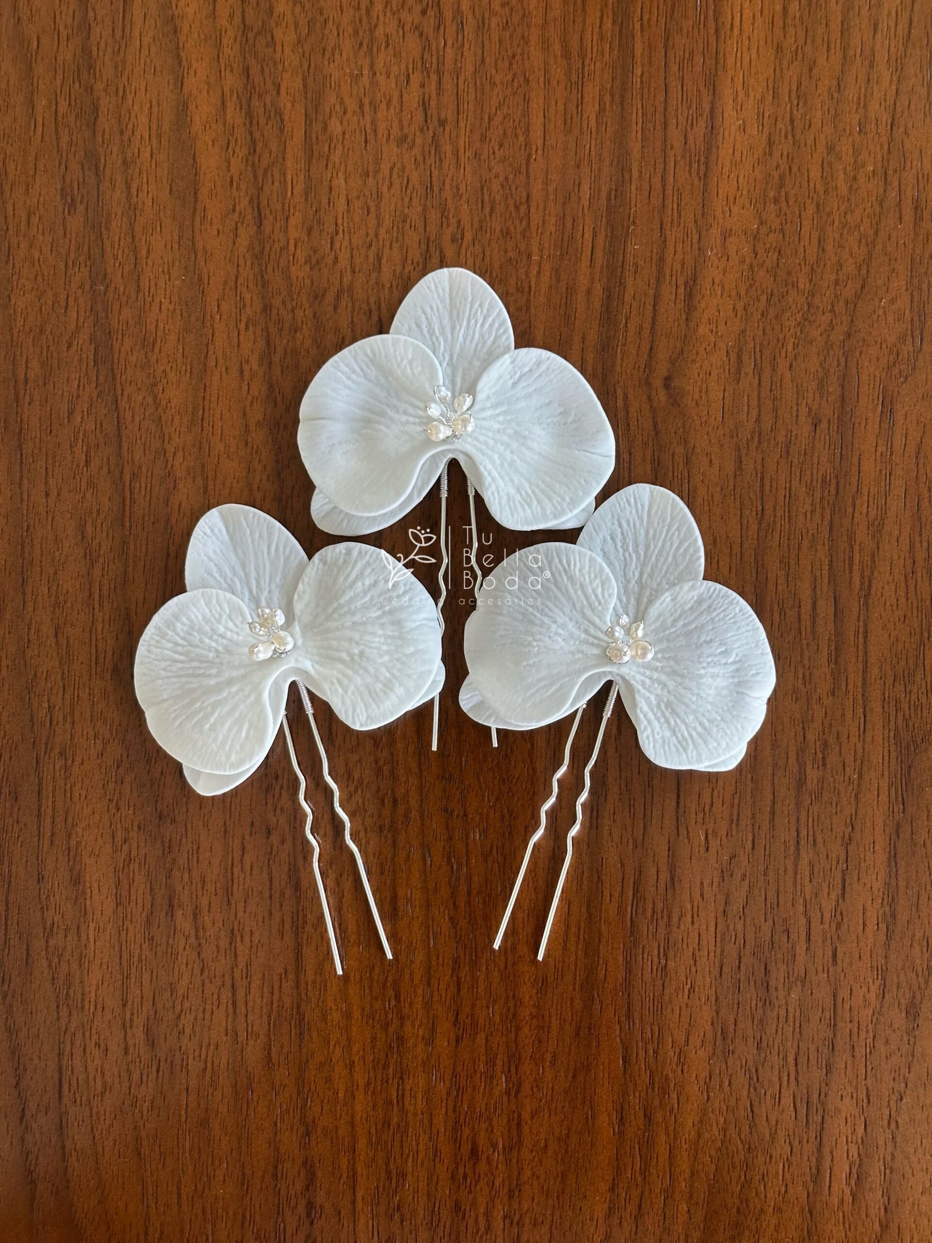 Set Sara: tres horquillas de porcelana en forma de orquídea con perlas de río naturales, un accesorio floral elegante para novias. Su diseño ligero y resistente permite que se integren fácilmente en recogidos, moños bajos o peinados semi sueltos, sin perder comodidad.