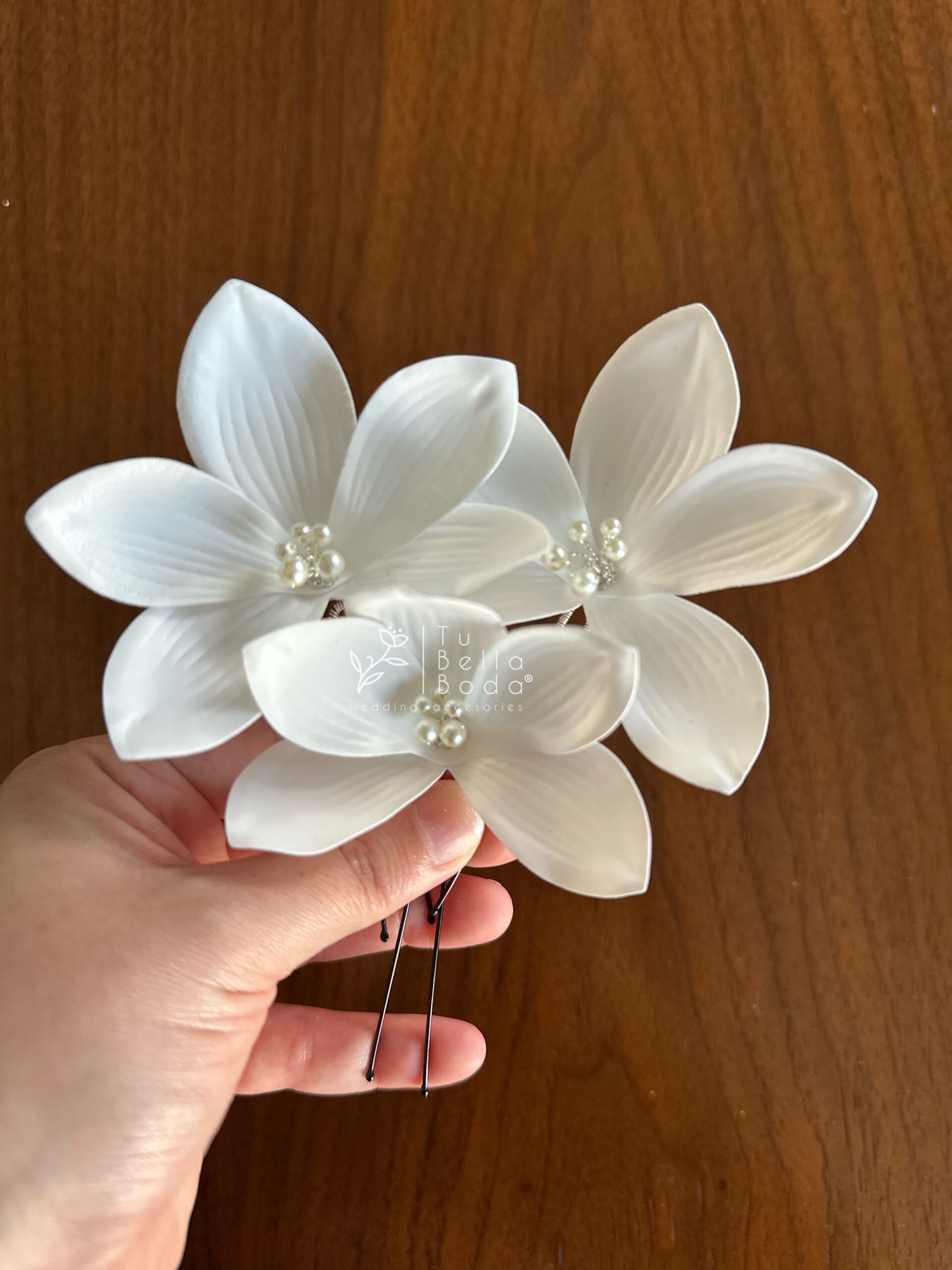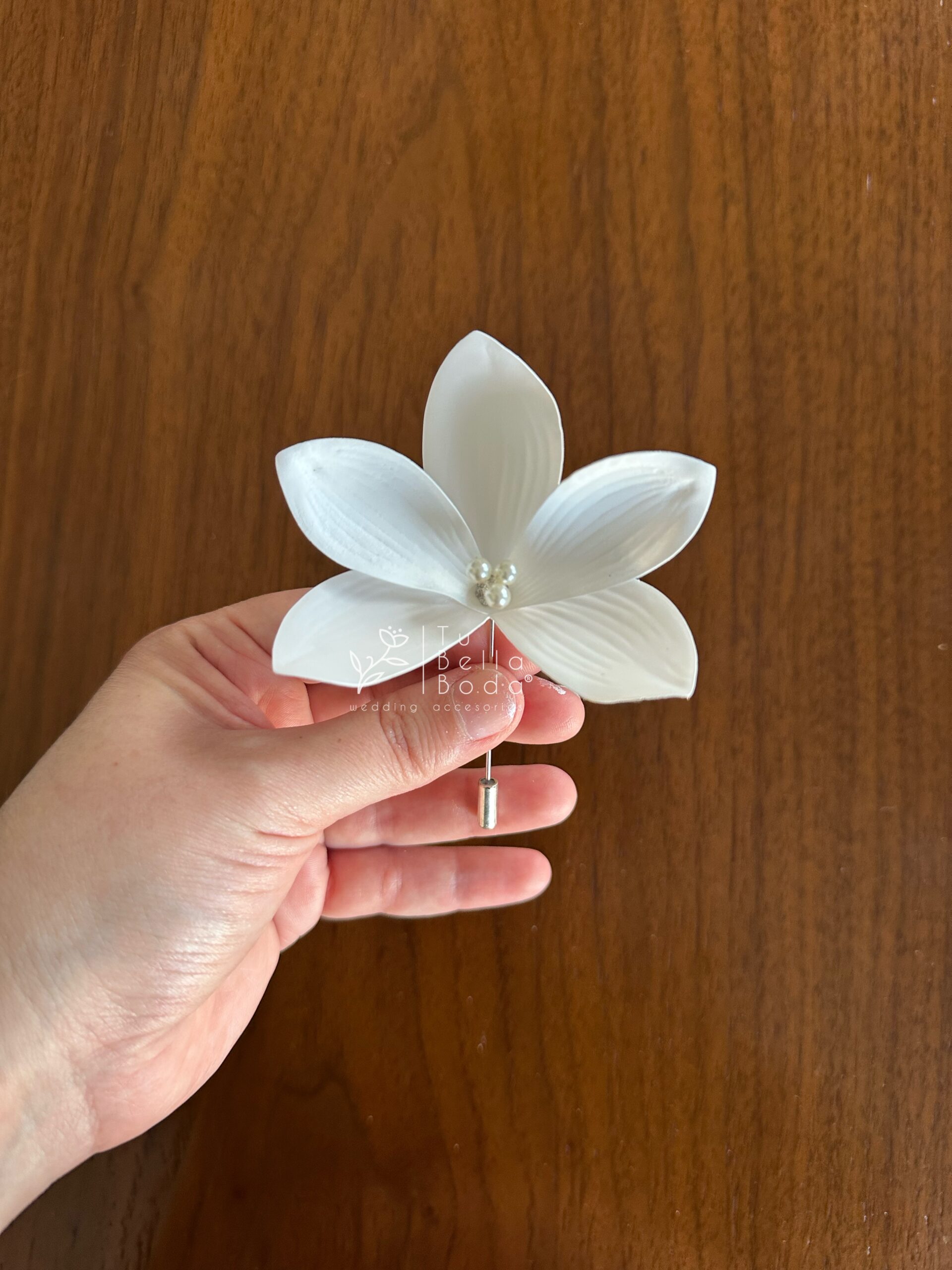 Set Vanilla: horquillas y boutonniere de orquídeas en látex con perlas ivory, perfectos para novias que buscan accesorios nupciales elegantes y realistas.